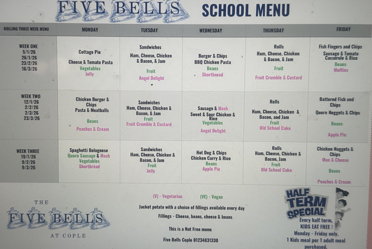 Delicious, healthy, hot meals are available daily, prepared and cooked in the Five Bells, Cople.